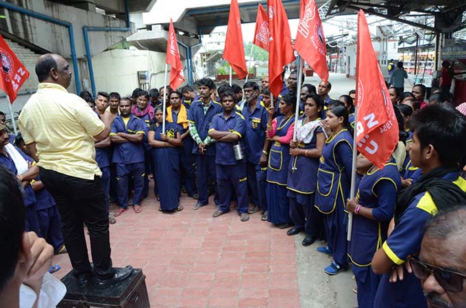 नागपुर :- मध्य रेल्वे नागपुर विभागातील आरोग्य निरीक्षकावर हल्ला कारणाऱ्याला अटक करावी, या मुख्य मागणीसाठी नागपुर रेल्वे स्थानकावरील कंत्राटी सफाई कर्मचाऱ्यांनी प्लेटफ़ार्म एक वर सोमवारी दुपारी “कामबंद आंदोलन” केले. यावेळी कामगारांनी मुख्य आरोग्य निरीक्षक कार्यालयावर मोर्चा काढला.